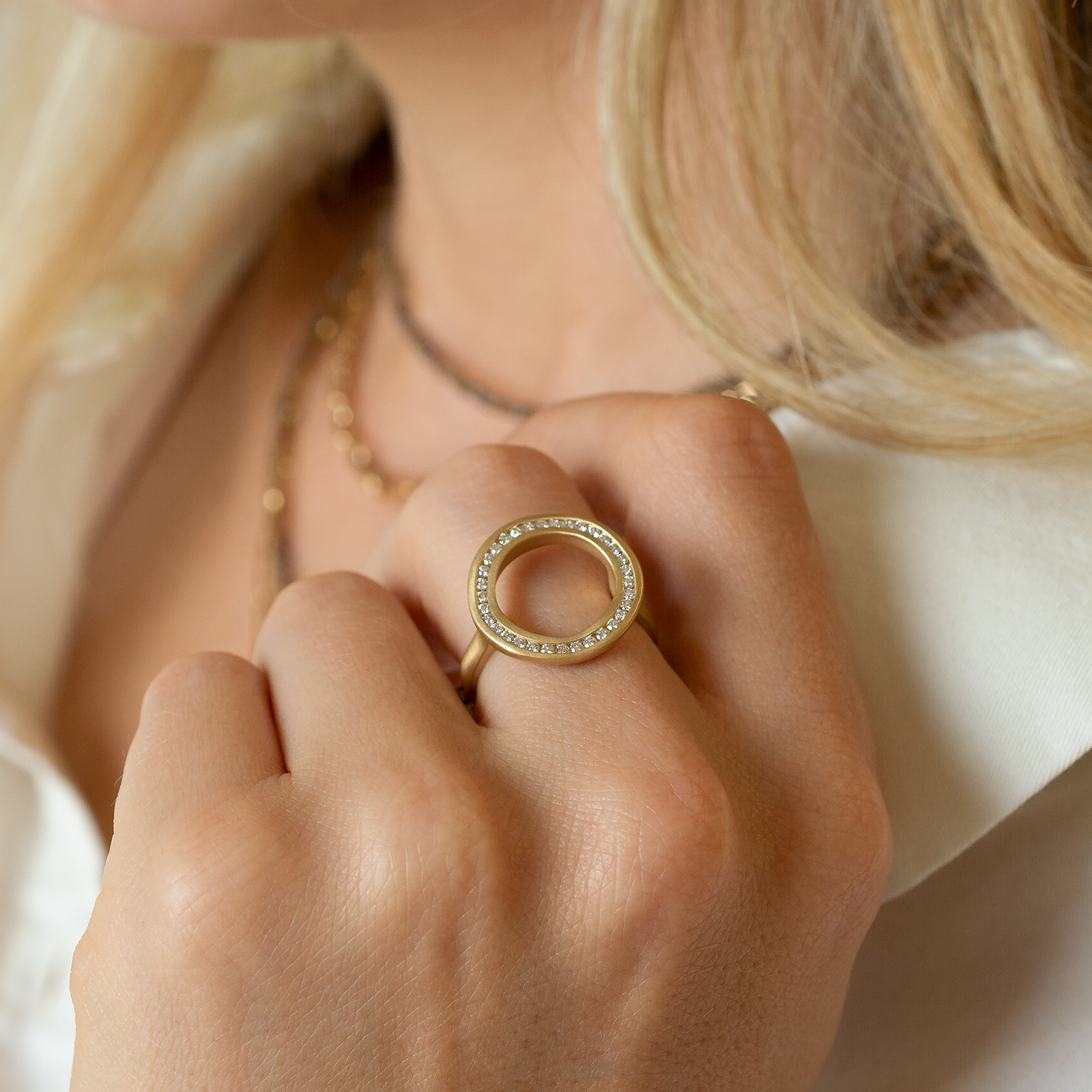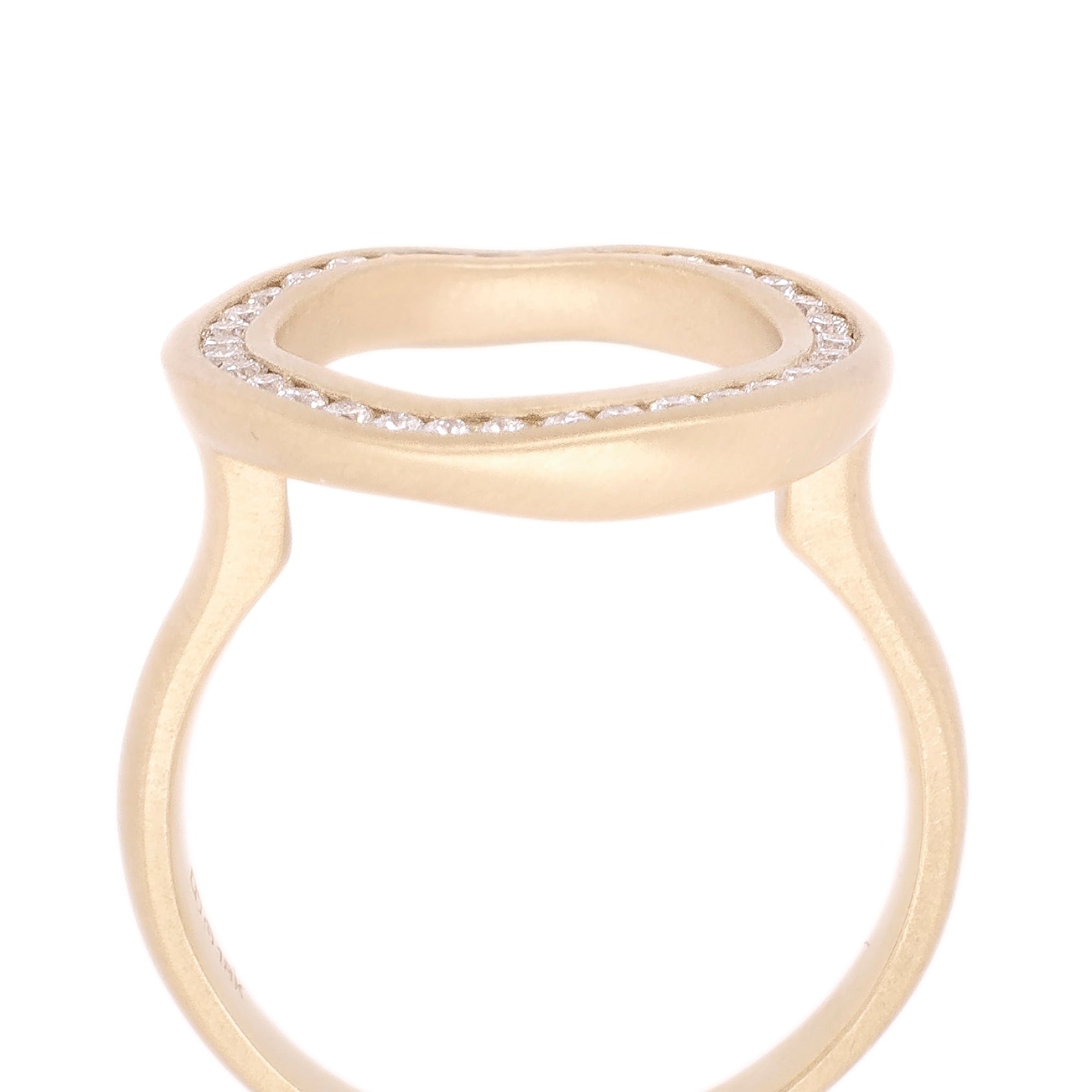 The gold organic channel set diamond circle of this ring inspires notions of the love we hope to feel for an infinity.