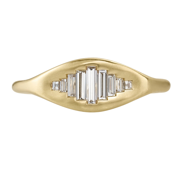 The Empire baguette diamond ring is handcrafted from 18K gold. This ring features glimmering baguette cut diamonds arranged in an art deco style formation and set in our unique take on a channel setting. A matte gold finish completes this chic and streamlined piece.