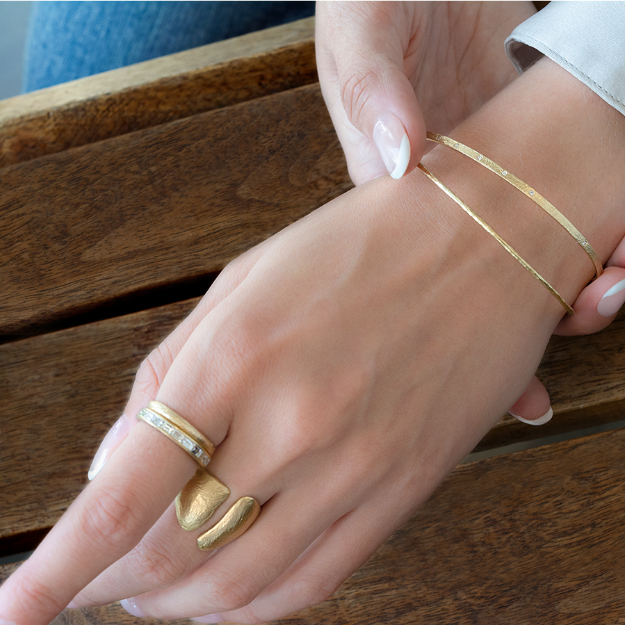 Crafted in solid gold with a classic ~2.5mm band, the 'Boulder' Textured Stacking Ring has a magnificently rugged texture that evokes the beauty of nature. An exquisite piece that lends an air of rare sophistication to any ensemble, this ring is elegant and timeless, exuding luxury and exclusivity.