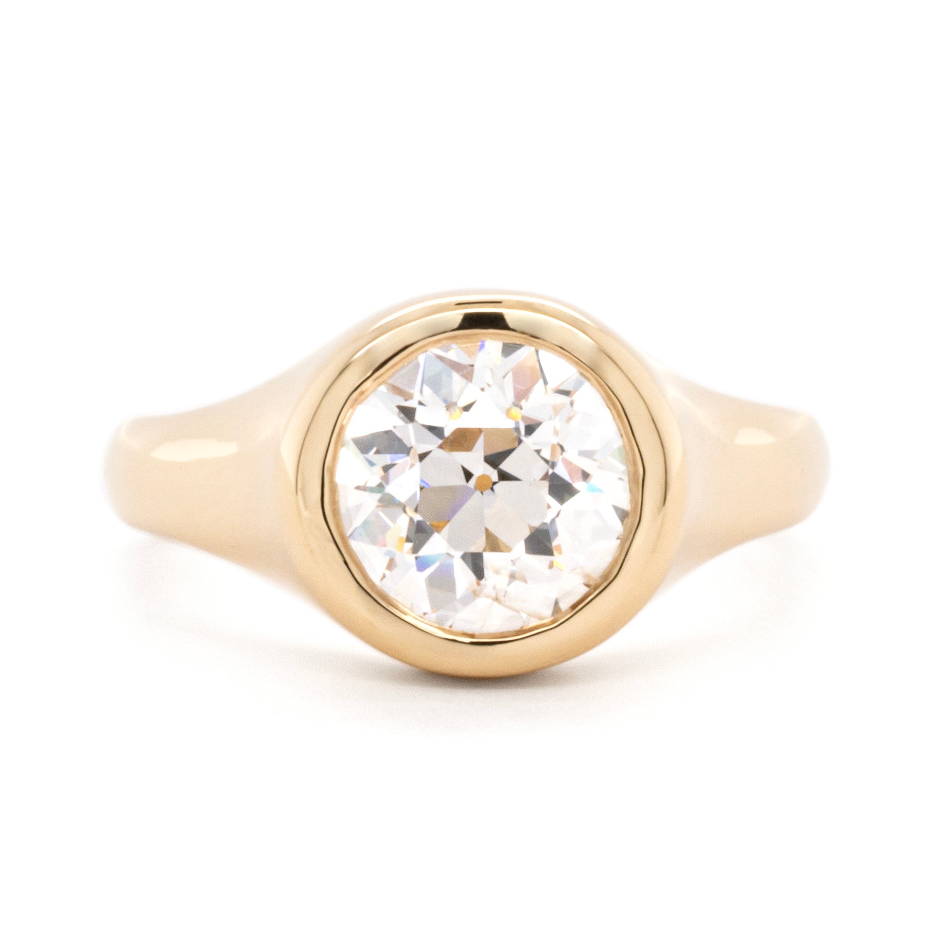 The Side Profile: Our soft signet-inspired style fully encompasses your diamond, keeping the ultimate low profile. We have a signature smooth cut-out towards the bottom, allowing you to stack it with another ring.
