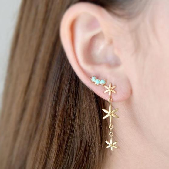 "Celestial" dangling star earrings. Gold mini star post earring with dangling 2 stars on fine cable chain.