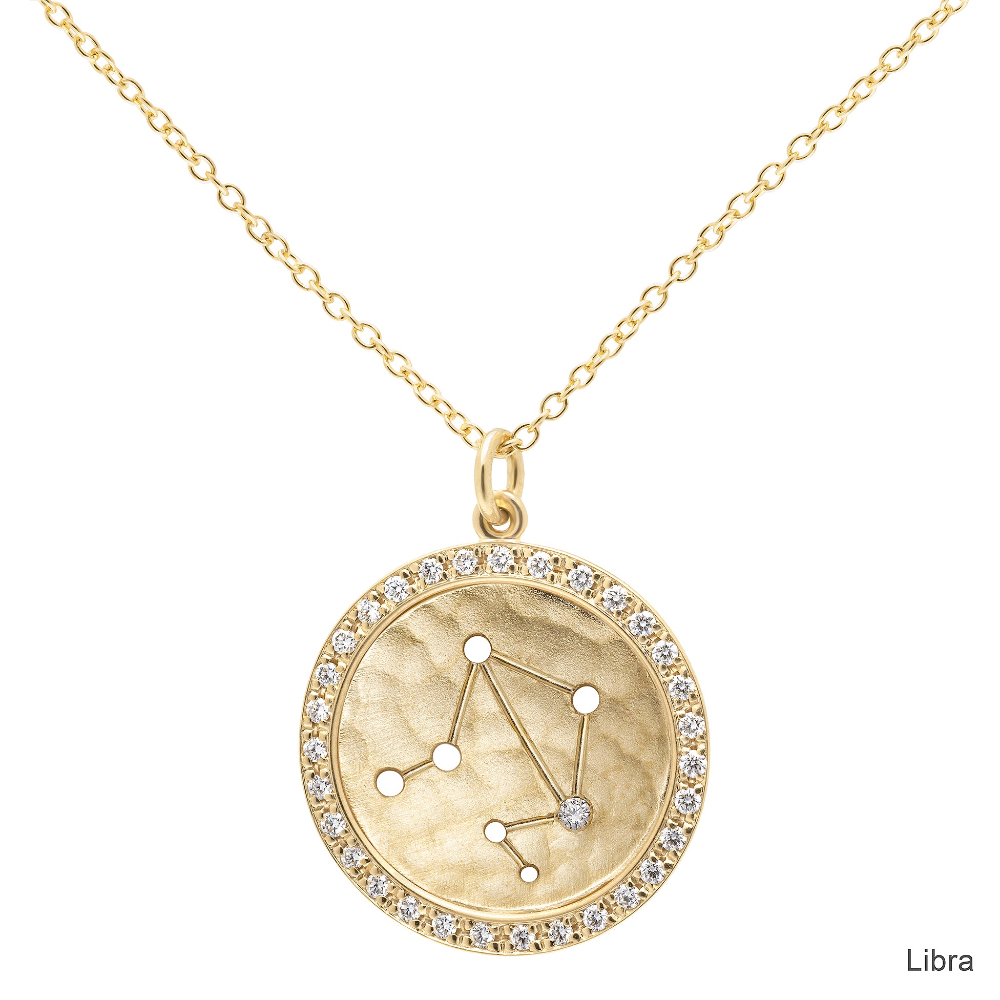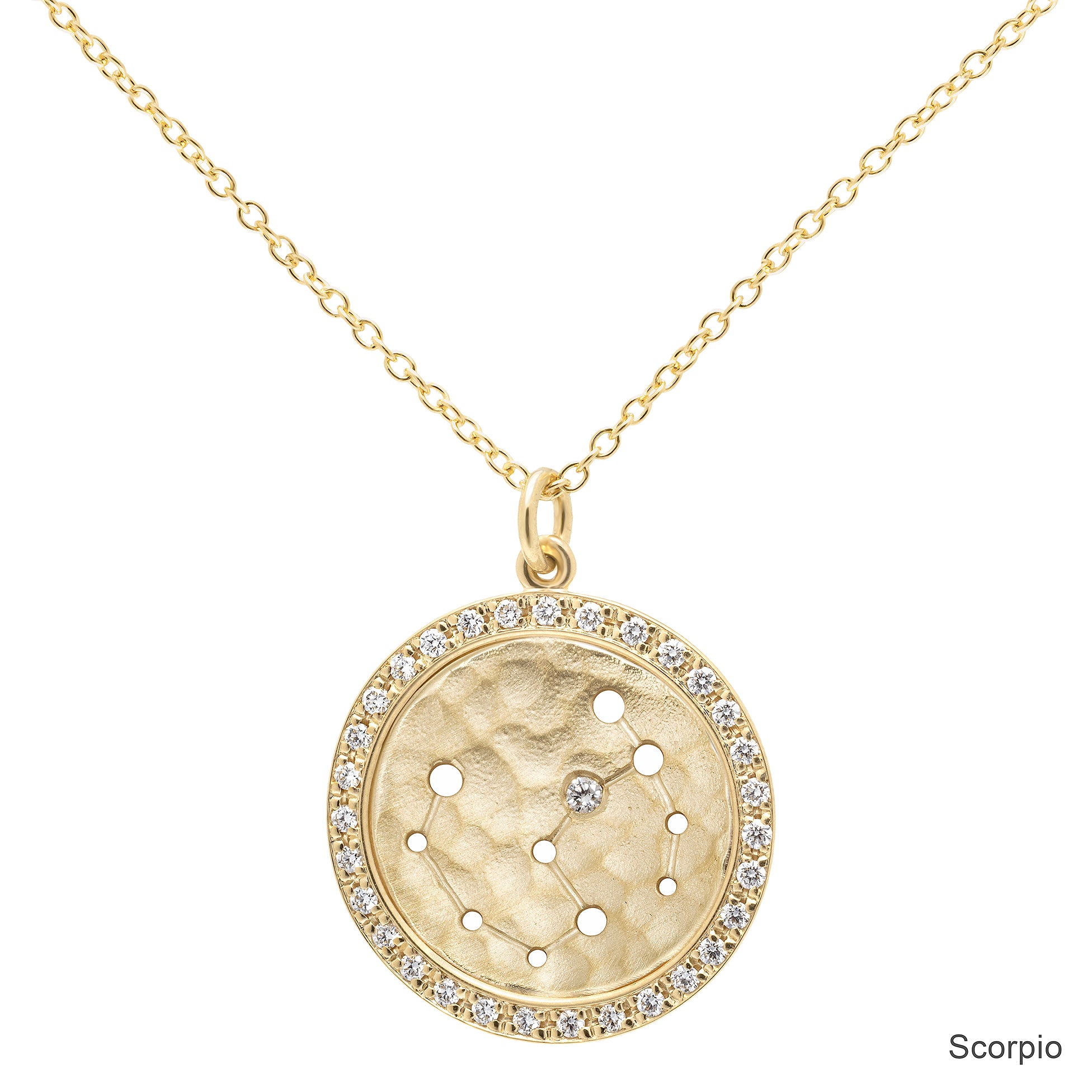 18k yellow or 14k white gold disc charm necklace with an astrological symbol and 1 x 0.01-carat diamond 'star' and 0.004ct pave diamond halo on 16-18" light cable chain. ~0.13 total carat weight.
