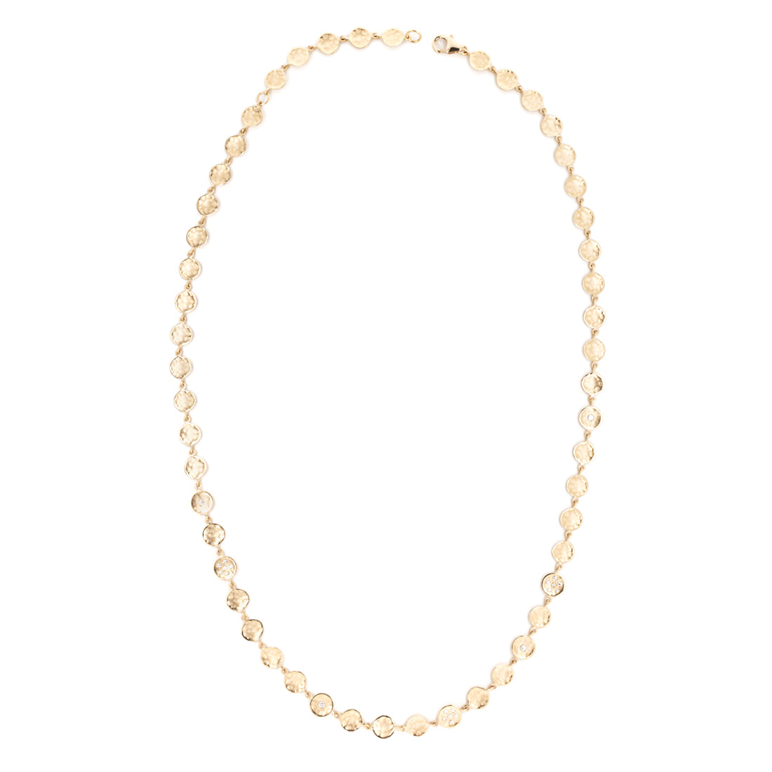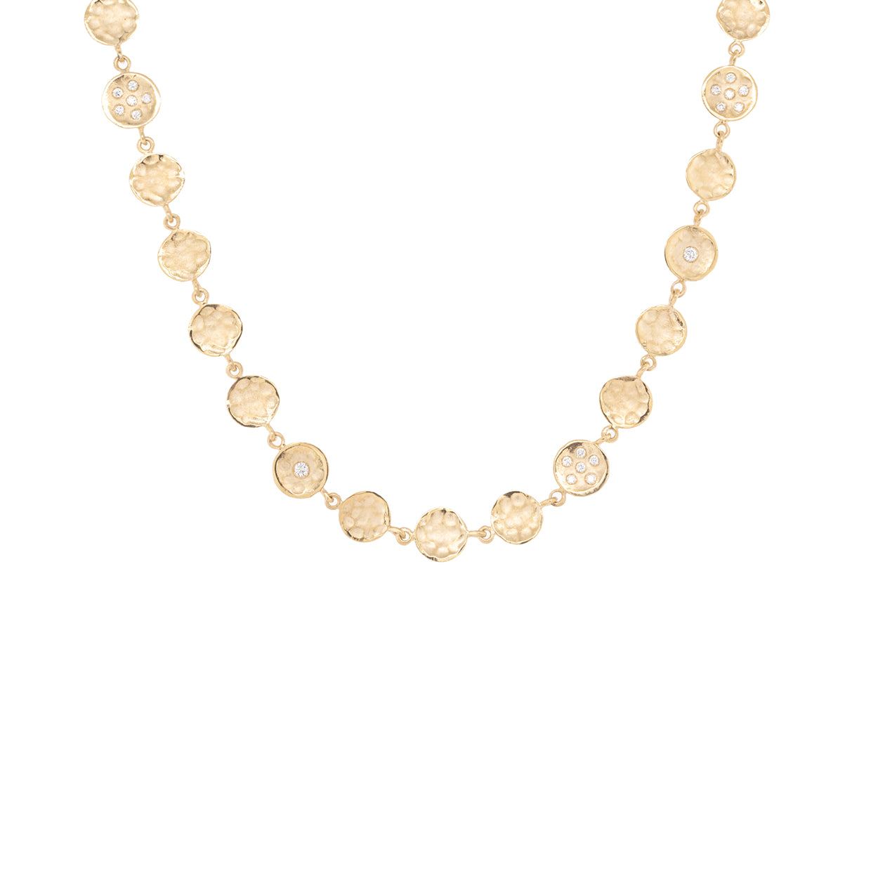 A statement piece showcasing 51 intricately linked 6mm hammered discs, intermittently accented with diamonds.