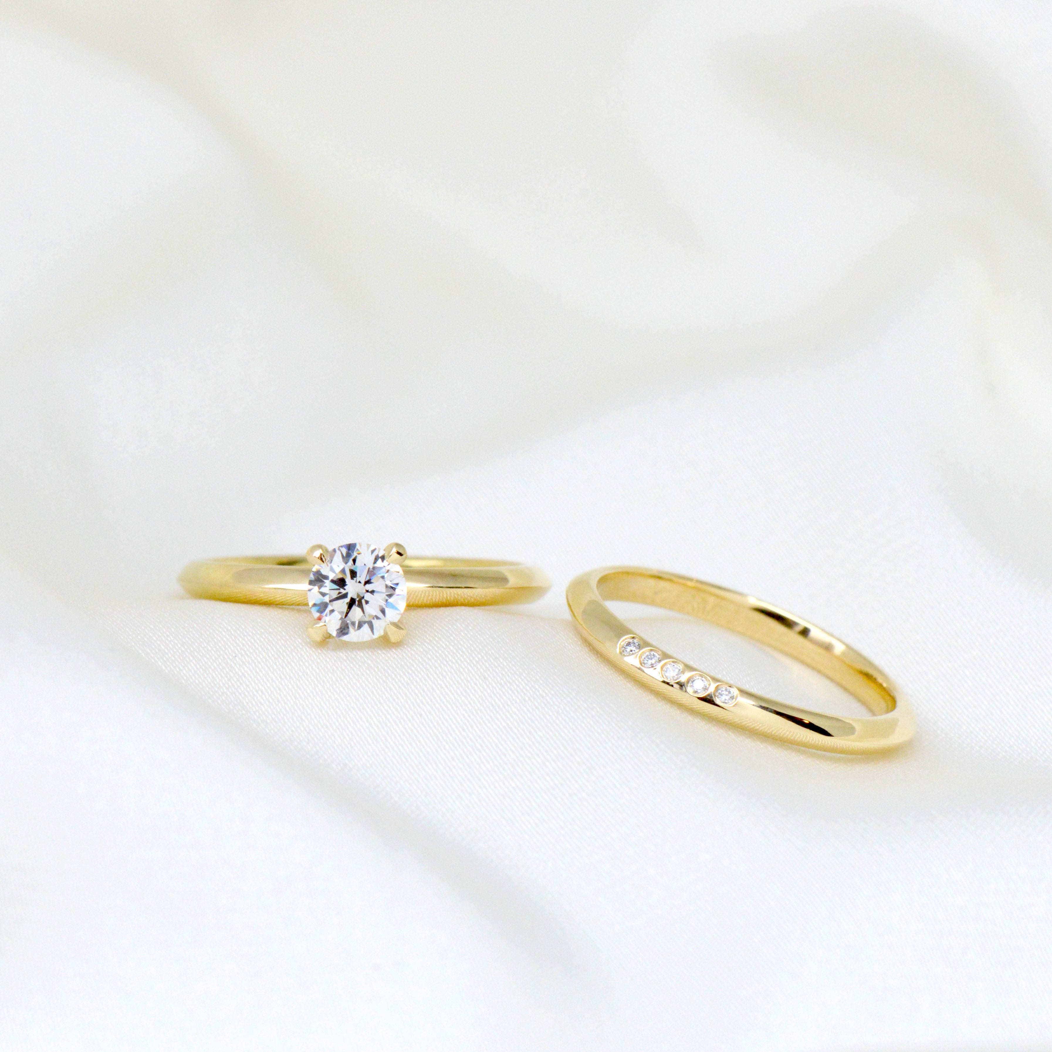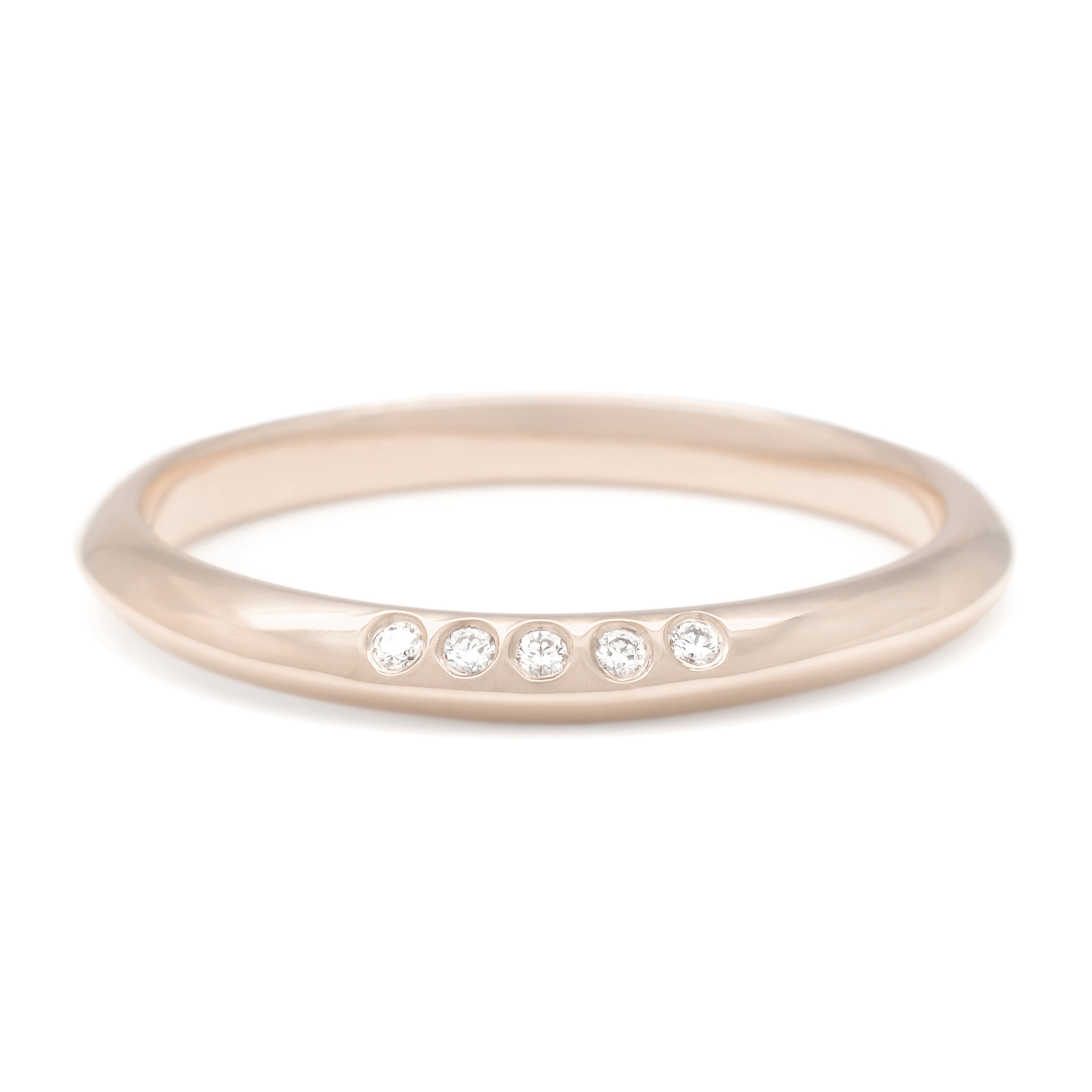Gold soft knife edge band (2mm) with cluster of 5 x 0.004ct round brilliant cut diamonds flush set on side edge. High polish.