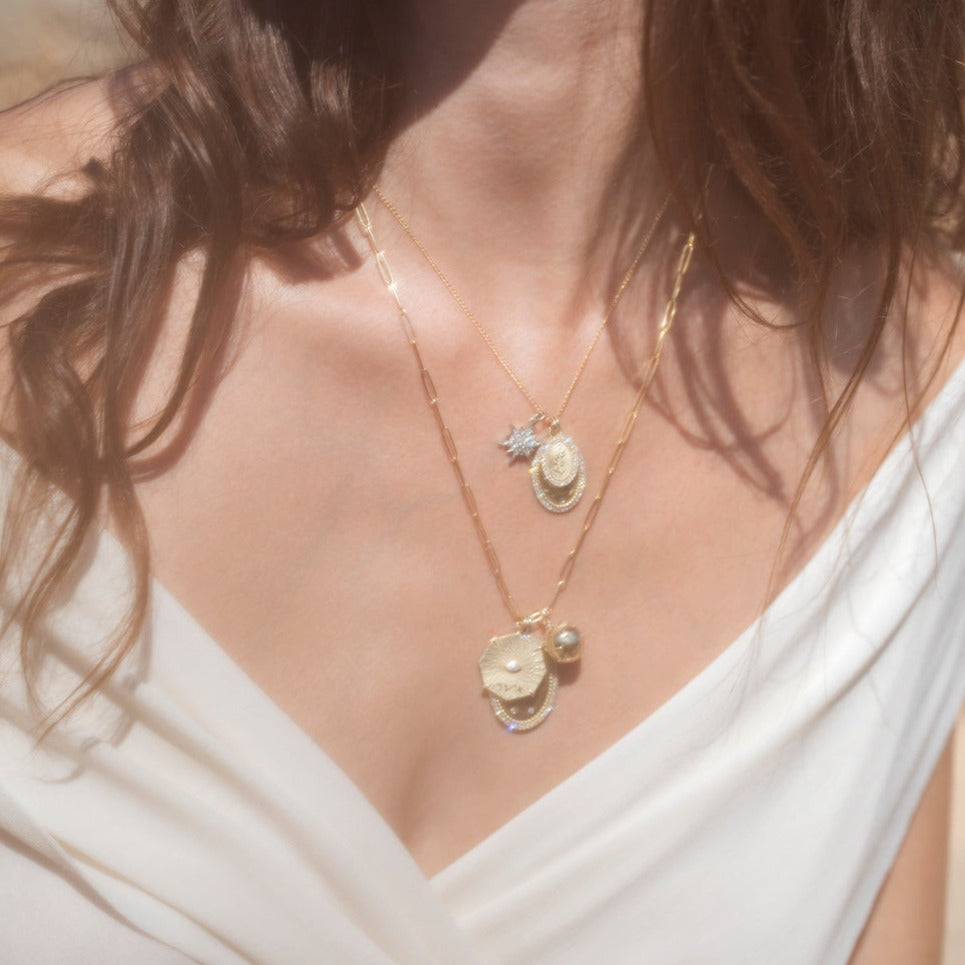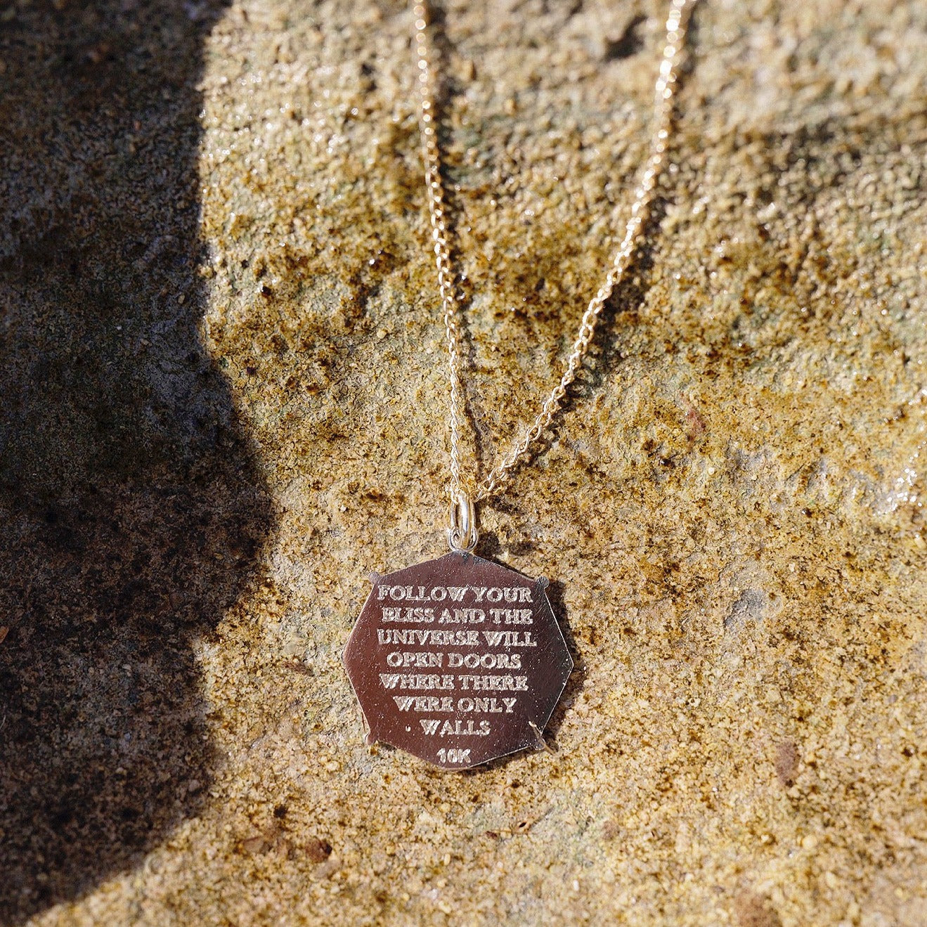 An Octagon shaped pendant sculpted in our sea-floor texture, with the word “Bliss” written in ancient Aramaic on the front.
